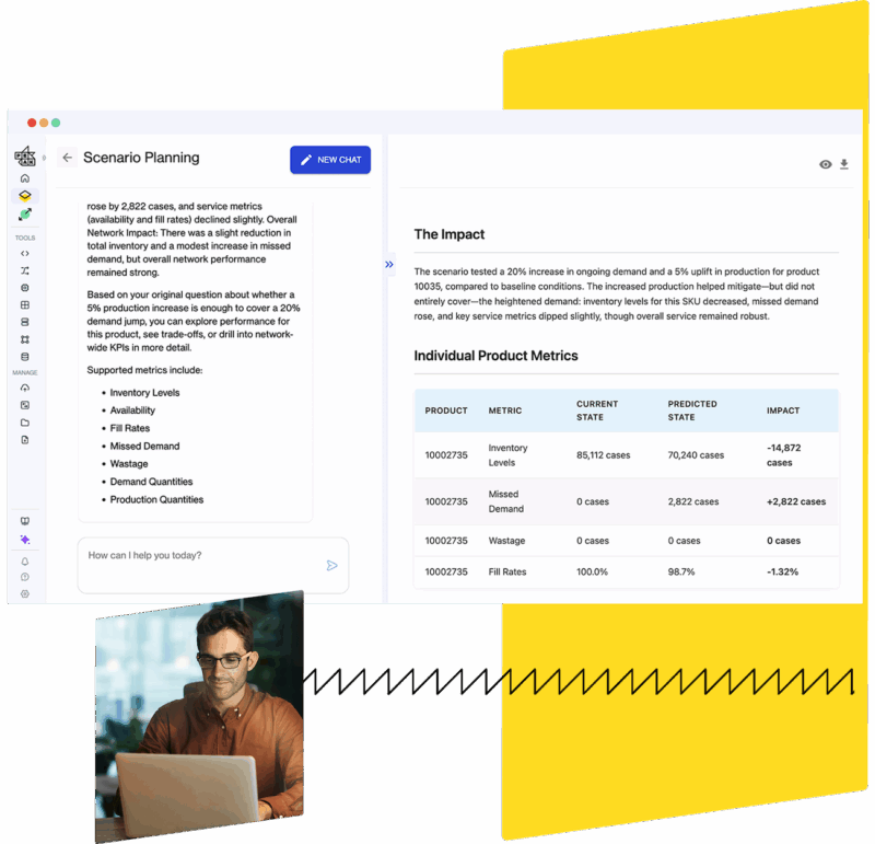 Whether it’s adapting to new sales forecasts, production challenges, stock level changes, raw material shortages or supplier shifts, Scenario Planning enables your team to simulate and instantly compare the real-world impact of these changes across cost, service, operations and labor metrics. Move from static, spreadsheet-heavy planning to fast, dynamic decision making powered by agentic AI.